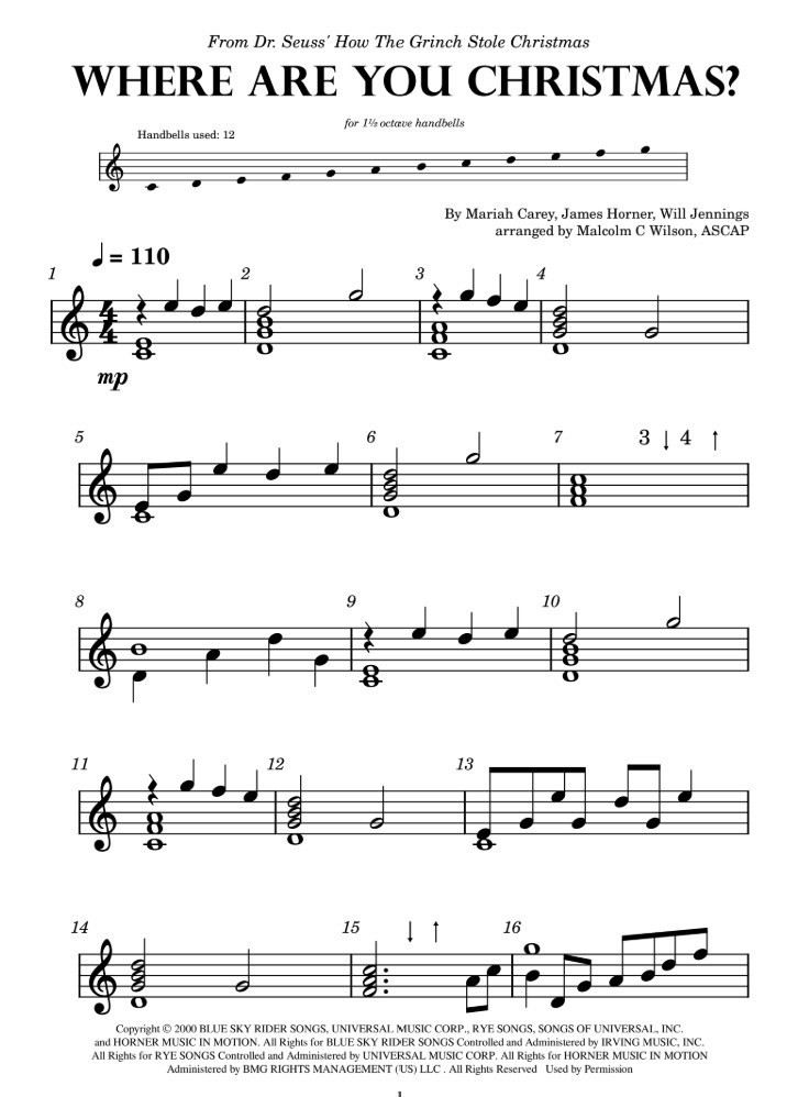Here’s a 12-bell arrangement (for F5-C7 or C5-G6) of the heartfelt ballad “Where Are You Christmas” from the beloved holiday film "How the Grinch Stole Christmas" (in the movie, young Cindy Lou Who sings of longing and wonder as she searches for the spirit of Christmas amidst the Grinch’s mischief and her town’s festive frenzy). A tender, evocative melody that has become a seasonal title of choice! Now available in a readily playable 12-bell setting, perfect for as few as three 4-in-hand handbell musicians to bring warmth and reflection to any festive performance.
